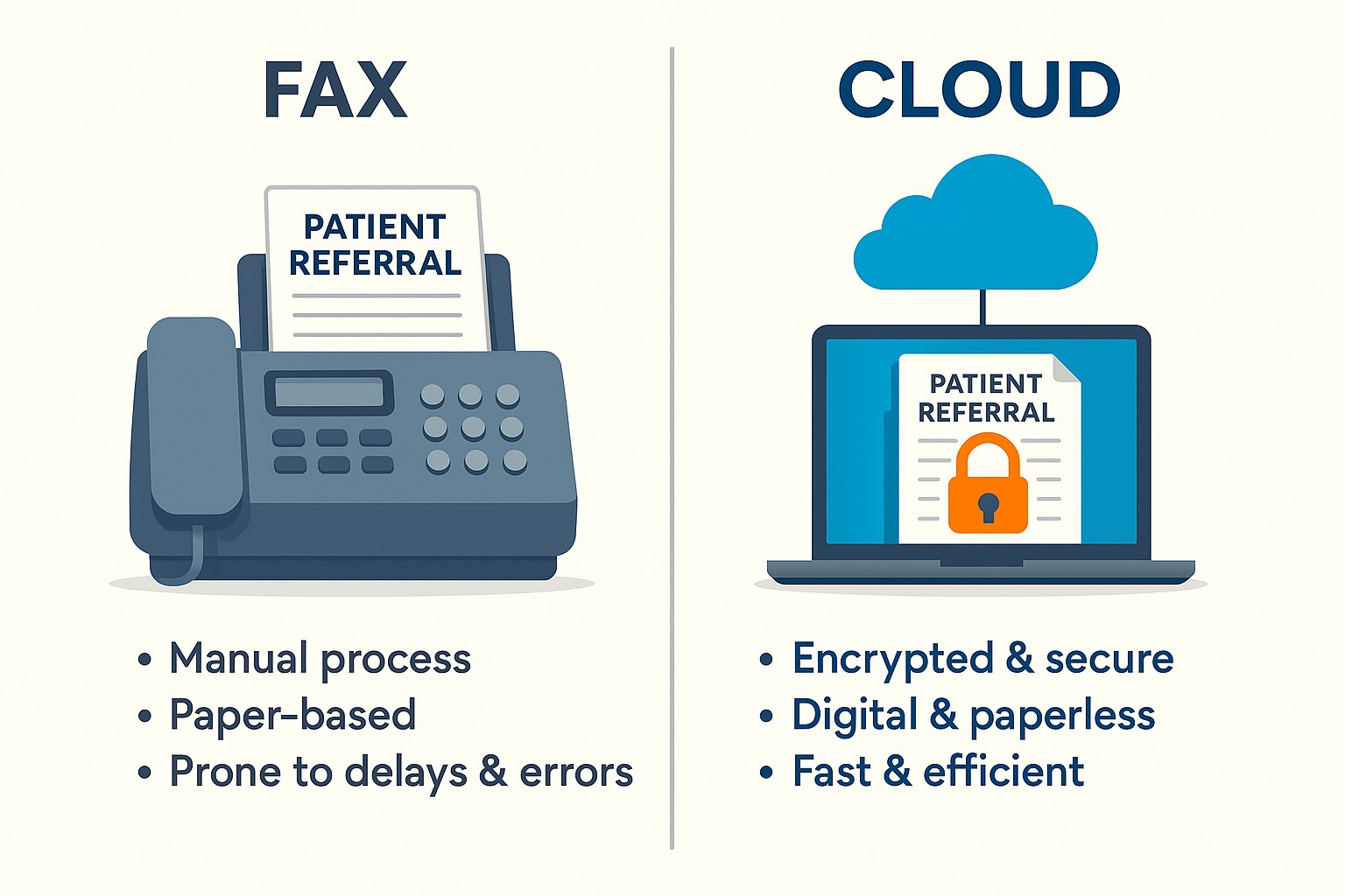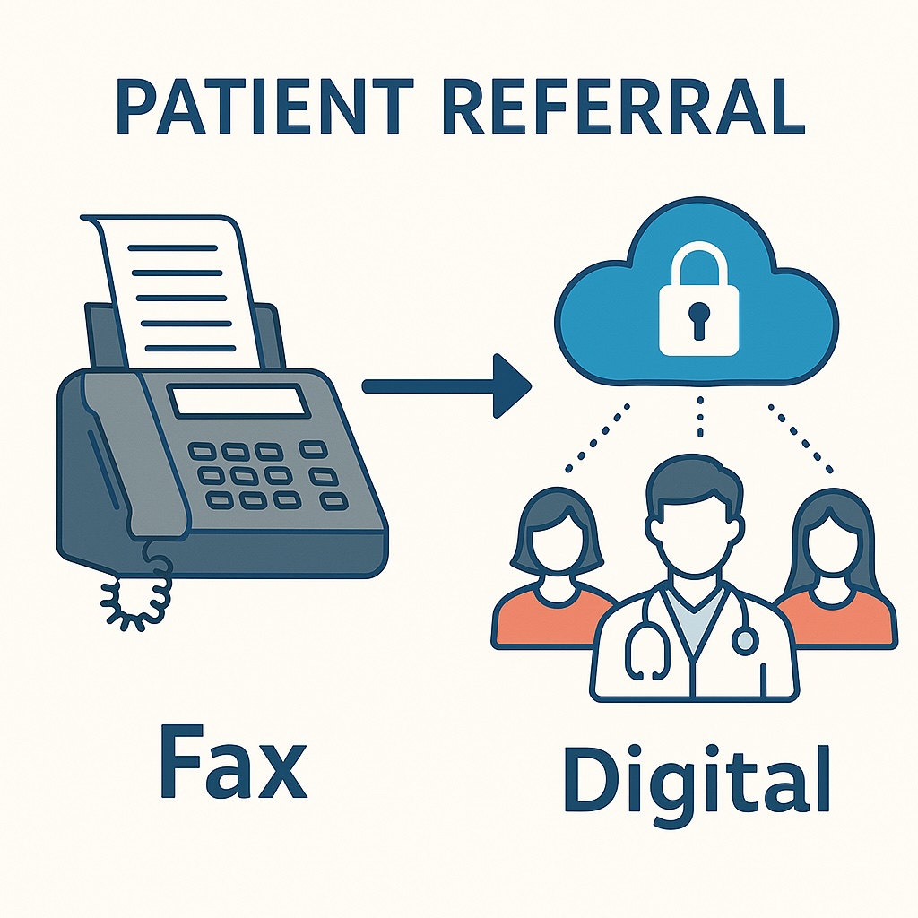 Our platform is designed to eliminate the inefficiencies and security risks of traditional fax-based referrals. Instead of printing, scanning, and waiting for confirmations, providers can exchange referral information instantly through a secure, encrypted cloud. This reduces lost paperwork, shortens turnaround times, and completely removes the need for outdated fax machines—bringing patient referrals into the modern, digital age.